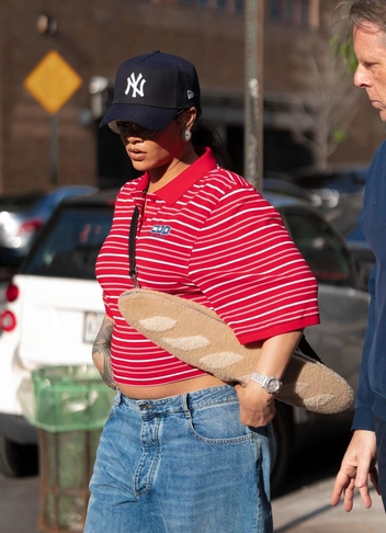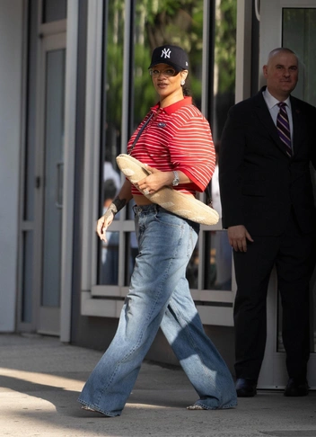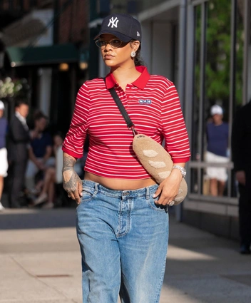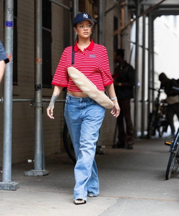 Последний аксессуар в виде багета Рианна надела вместе с прямыми голубыми джинсами и футболкой в стиле преппи. Спортивный образ дополнила кепка, а также серьги с внушительными бриллиантами для контраста.