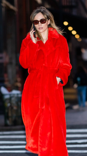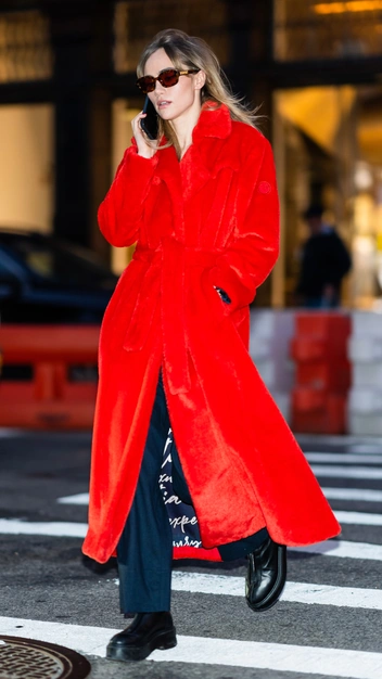 Сьюки Уотерхаус выглядит бесподобно в этом модном аутфите. Знаменитость надела широкие брюки, классические ботинки на платформе и солнцезащитные очки, но все наше внимание приковано на шубу. Она выбрала объемную модель в ярко-красном цвете и подчеркнула талию поясом. Нравится нам в этой шубе и ее подкладка — черная с акцентными надписями.