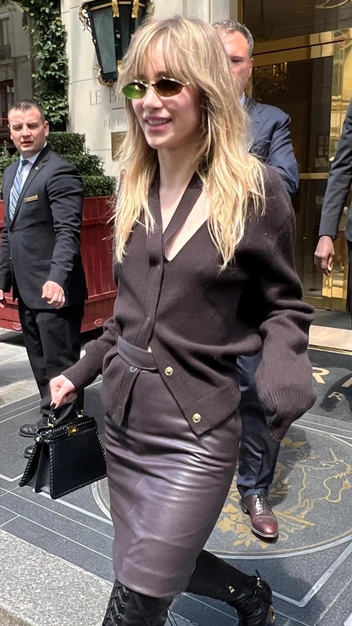 Сьюки Уотерхаус доказала, что трикотажный кардиган с вырезом в зоне декольте в сочетании с кожаной юбкой в бордово-коричневом оттенке смотрится соблазнительно. Однако дополнять образ она решила не туфлями-лодочками, которые так и хочется примерить с этим луком, а трендовые сапоги на шнуровке, о возвращении в моду которых все вокруг говорят. Дерзкую обувь звезда балансирует лаконичной сумкой.
