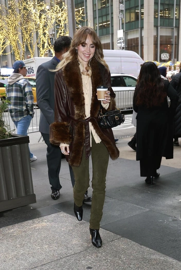 После рождения ребенка от Роберта Паттинсона Сьюки не так часто выходит на публику. Однако папарацци удалось подловить актрису в Нью-Йорке, когда она отправлялась на шоу Келли Кларксон. Сьюки надела брюки оттенка хаки и рубашку цвета butter, но главным акцентом образа стала дубленка. Глубокий темно-коричневый цвет и отделка из меха сделали образ более роскошным.