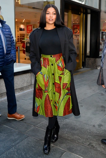 Яркие оттенки Тараджи Хенсон идут особенно, и она этим активно пользуется даже зимой. Все потому, что американская актриса точно знает, как сделать так, чтобы контрастные брызги красок смотрелись уместно в любых ситуациях, даже когда за окном – непроглядная погода. Лайфхак прост: нужно лишь уравновесить яркий цвет базовым черным. К облегающему топу и классическому пальто с увеличенной линией плеч она добавляет сапоги того же оттенка с металлическим носом и юбку с ярким растительным принтом от бренда JSN Studio.