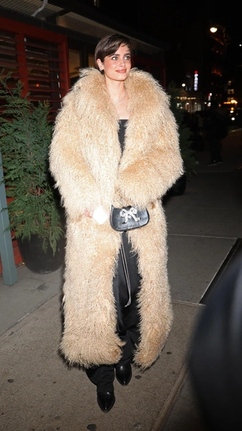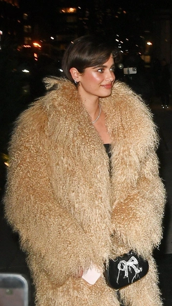 В этом году все звезды выбирают вместо пуховиков шубы — тренды Slavic Bimbo и Mob Wife сделали свое дело. Девушки по всему миру мечтают носить роскошный мех, как, например, и Тейлор Хилл. Топ-модель выбрала для ужина элегантный образ и надела черное платье-комбинацию в пол, к которому подобрала кожаные сапоги и маленькую сумку. Акцент она сделала на макси-шубе с длинным ворсом.