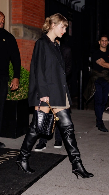 Ботфорты в осенне-зимнем сезоне 2023/24 стали одной из самых модных пар обуви, которую все чаще выбирают селебрити. Тейлор Свифт не удержалась и примерила новинку своего гардероба — высокие кожаные сапоги с квадратным мысом и декоративной цепью. С чем носить такую обувь? Дизайнеры и стилисты рекомендуют останавливать свой выбор на коротких платьях или юбках, что и сделала певица. Она надела базовый черный топ, теннисную юбку и придала выходу сдержанность за счет свободного пиджака.