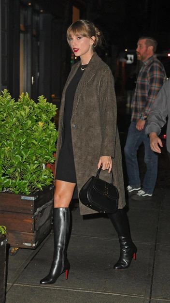 В последнее время Тейлор Свифт радует поклонников своими образами: она все больше отходит в элегантный и женственный стиль, но при этом не изменяет своему характеру. Именно поэтому в недавнем образе певица примерила «маленькое черное платье», лаконичное пальто в клетку и подобрала к вечернему выходу акцентные кожаные сапоги до колена с красной подошвой. Эффектный лук она завершила сумкой, украшениями и, конечно, алой помадой.