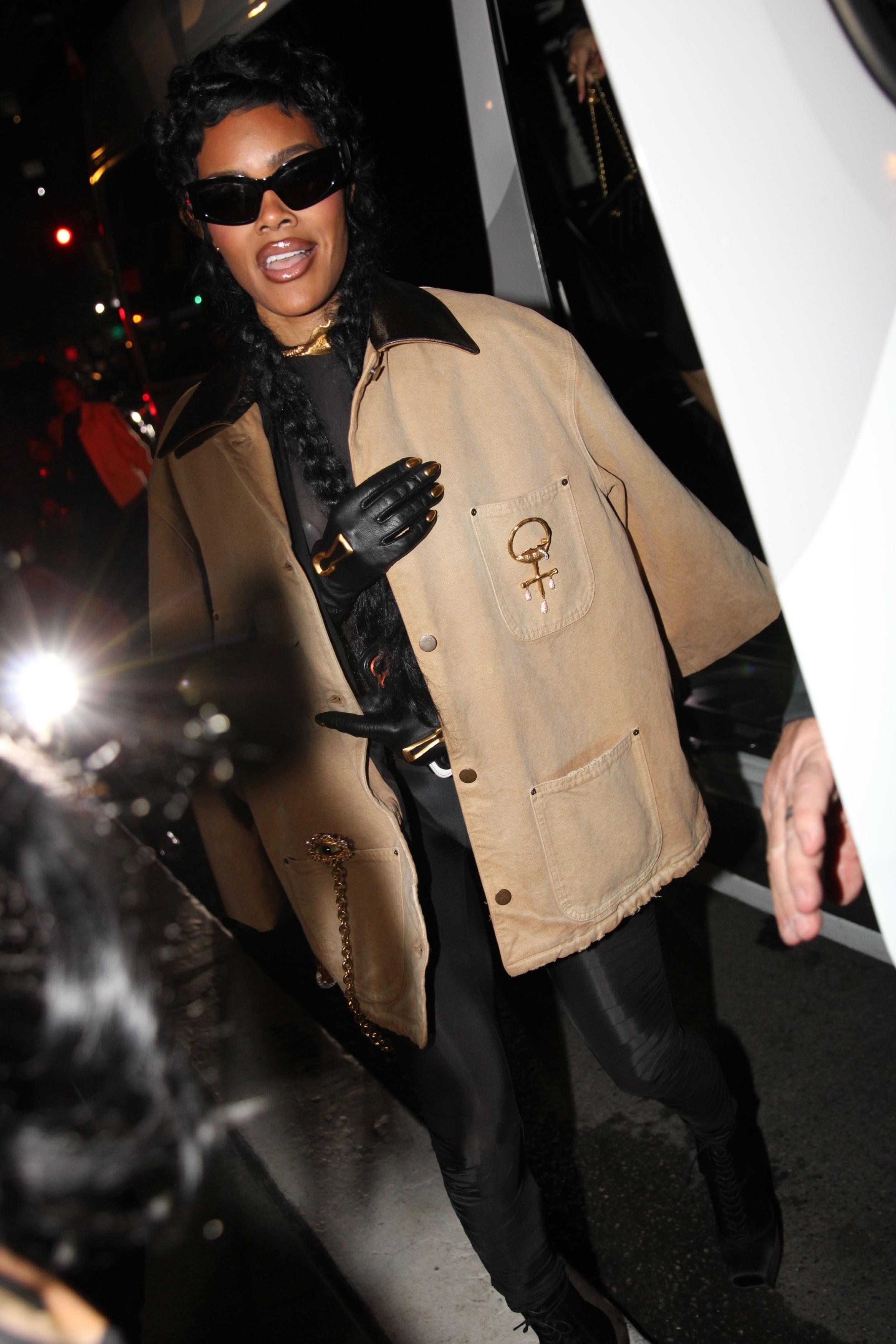 Тейяна Тейлор доказывает, что утилитарный силуэт «куртки рабочего» уверенно чувствует себя даже в вечернем дресс‑коде. Объемная бежево‑песочная модель, накинутая поверх полупрозрачного комбинезона, превращается из практичной вещи в эффектный контраст к драматичному, почти кутюрному total black. Это идеальный пример стайлинга barn jacket: чистый американский минимализм плюс аккуратная нотка элегантности во всем остальном образе.