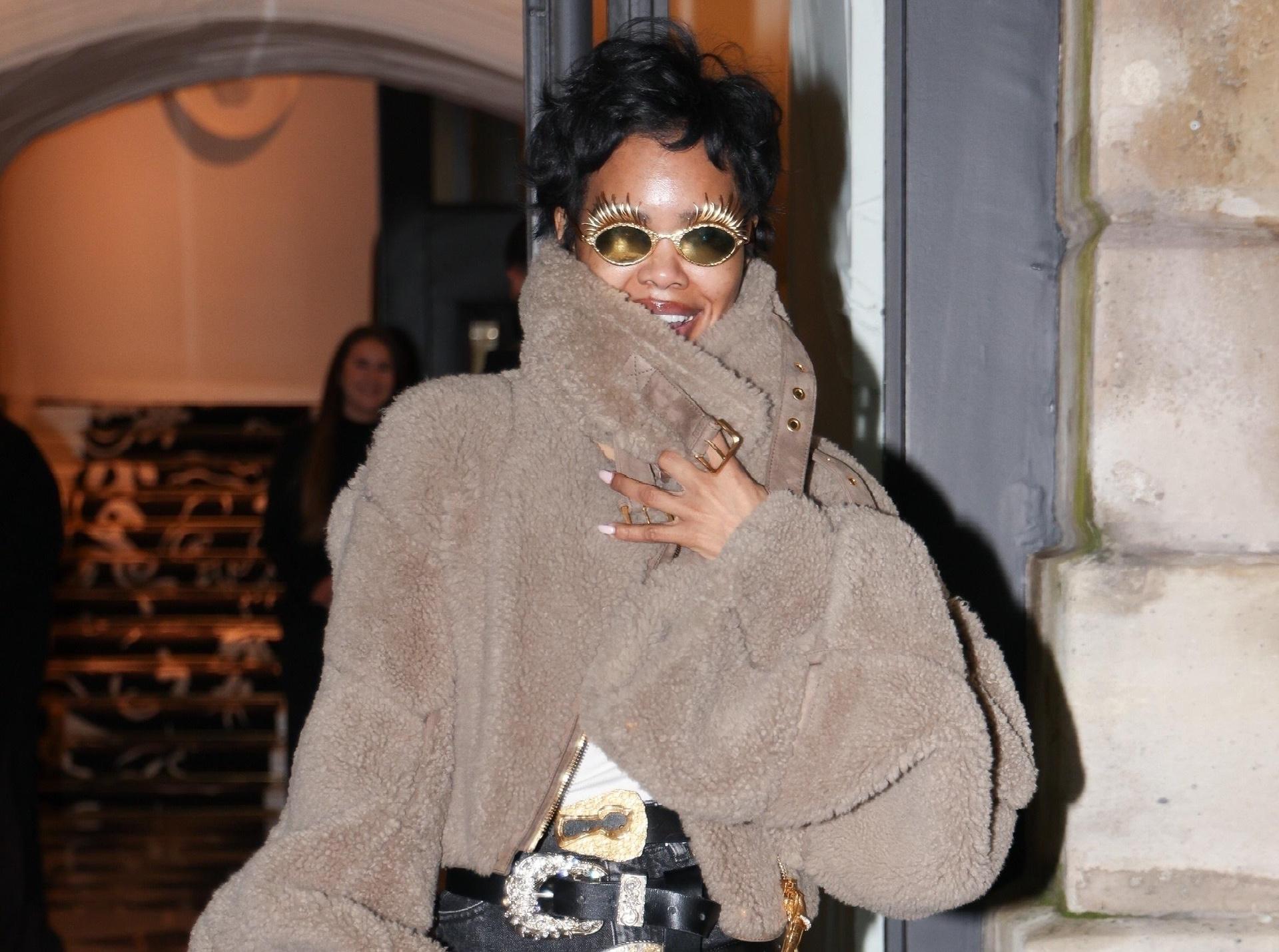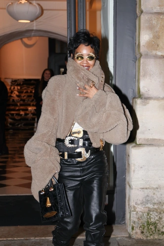 Певица выходит из бутика как будто с обложки модного журнала: плюшевый объемный бомбер цвета капучино контрастирует с гипердраматичными кожаными брюками со шнуровкой по всей длине ноги. Высокий блестящий корсет‑пояс с золотыми пряжками и скульптурная черная сумка превращают практичный зимний комплект в почти художественную инсталляцию — именно за эту смесь уюта и агрессивного глэма Тейяну и называют одной из самых главных икон стритстайла современности.