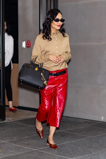 Тесса Томпсон появилась на знаменитом ночном ток-шоу WWHL в Нью-Йорке в эффектном образе, где красная кожаная миди-юбка стала главным акцентом. Актриса гармонично стилизовала ее с коричневой рубашкой и туфлями рубинового цвета, создавая тонкий контраст и глубину. Завершила образ культовая сумка Hermès Birkin, которая придала всему аутфиту неповторимый шик и статусность. Каждый выход Тессы — это безупречное сочетание смелости и изящества, которое неизменно привлекает взгляды и восхищения публики.