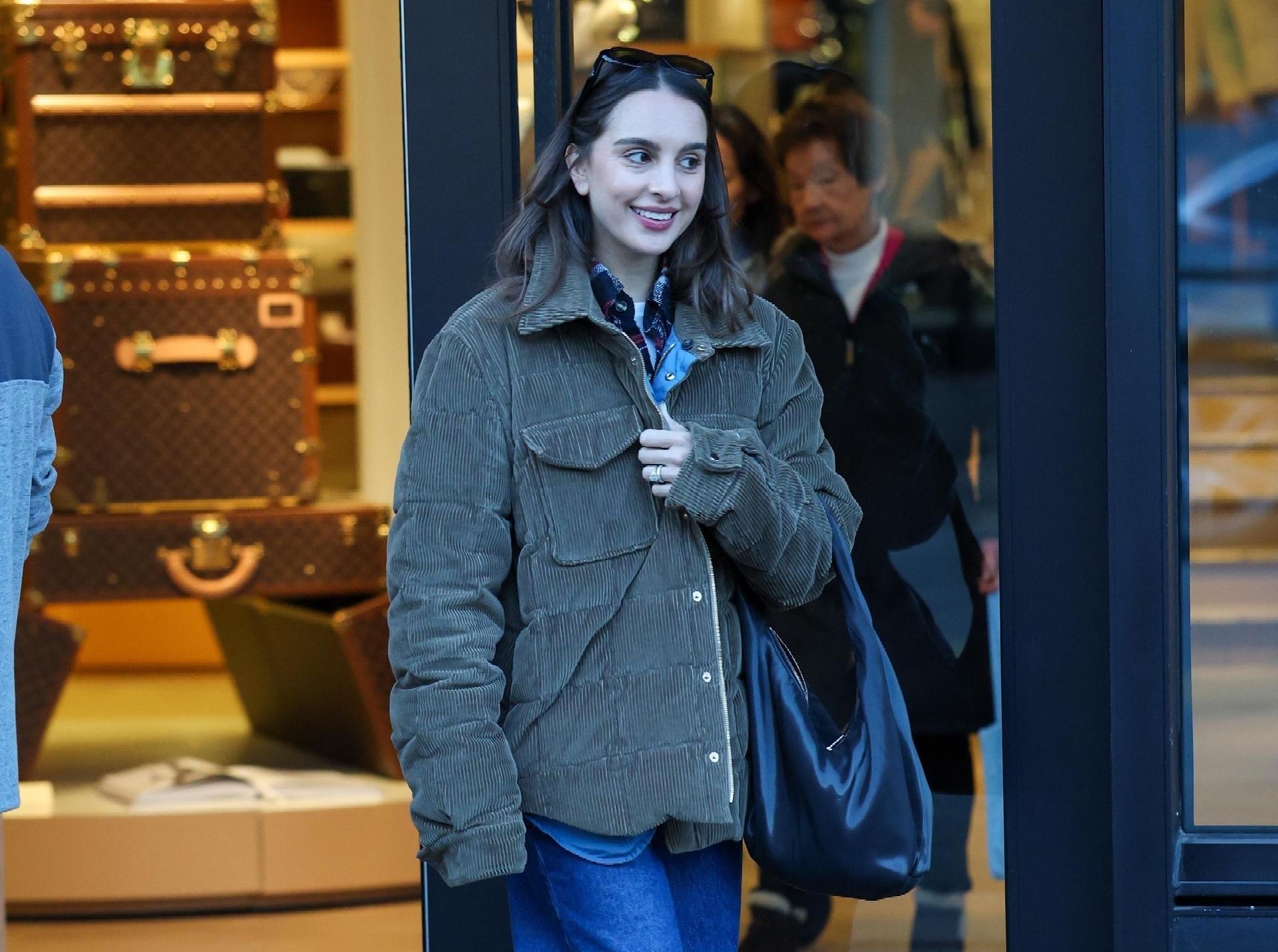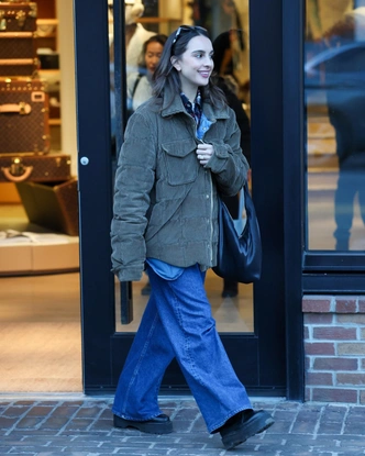 Алексия Умански выходит из бутика в максимально расслабленном, но очень продуманном образе в лучших традициях «тихого люкса»: объемная «куртка рабочего» оливкового оттенка задает уютное зимнее настроение, а широкие джинсы и грубые ботинки добавляют легкого калифорнийского кэжуала, который пришелся кстати даже в заснеженном Аспене. Кожаная шоппер‑сумка и солнцезащитные очки, стильно надетые на голову, работают как ненавязчивые маркеры «городской девочки», а многослойность с рубашкой и базовым топом делает этот лук идеальной формулой для декабрьских прогулок.