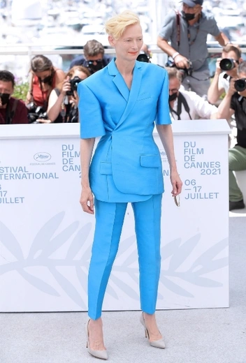 Появление неподражаемой Тильды Суинтон на 74-м Каннском кинофестивале ждали с замиранием сердца не только поклонники актрисы, но и модные обозреватели. На главном киномероприятии года звезда традиционно выступает в рядах общепризнанных икон стиля, среди которых значатся такие имена, как Кейт Бланшетт, Николь Кидман, Джулианна Мур и многие другие. Для фотоколла премьеры фильма Уэса Андерсона «Французский вестник» звезда примерила брючный костюм Haider Ackermann в роскошном небесно-голубом оттенке, который эстетично смотрелся на контрасте с красным цветом ковровой дорожкой. Знаменитость дополнила наряд светло-серыми туфлями и макияжем с персиковым акцентом на губы.