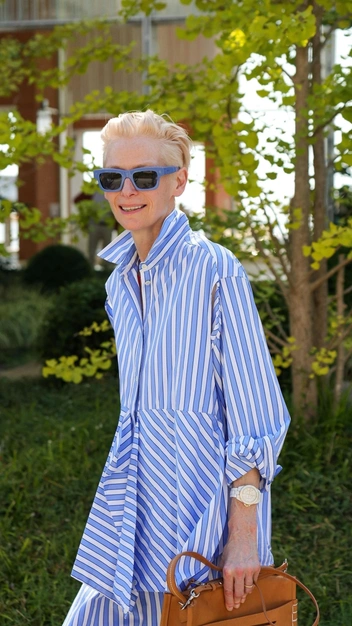 В этом году узор «полоска» стал одним из самых модных, а причина тому — тренд на офискор, где без вертикальных линий практически не обходится ни один костюм. Однако дизайнеры отдают предпочтение не только вертикальному принту, но и горизонтальному или хаотичному. Тильда Суинтон последовала тенденции, примерив эффектный костюм свободного кроя в голубую полоску. Его она дополнила коричневой сумкой, белыми сабо и очками.
