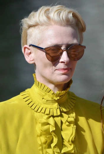 Наглядный пример идеальной сочетаемости блонда и ярких желтых оттенков (в случае Тильды – ближе к лимонному). На актрисе – минималистичный образ от французского Haider Ackermann.