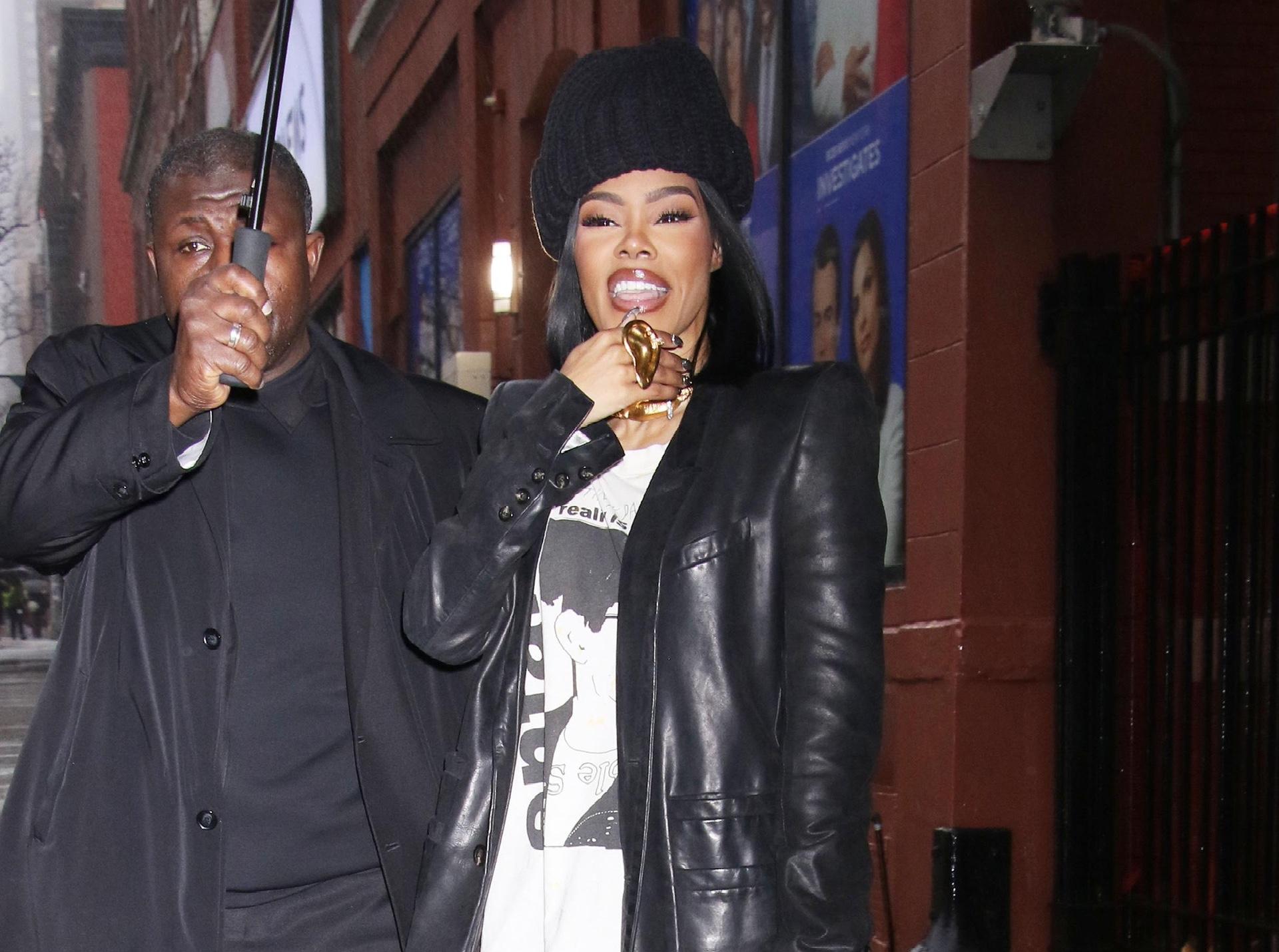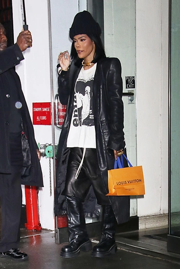 Тияна выходит в дождь как персонаж графического романа: длинное кожаное пальто в паре с широкими кожаными штанами и массивными сапогами превращает обычный черный тотал‑лук в «броню американского супергероя». Поверх принтованного белого лонгслива весь этот «панцирь» смотрится не мрачным, а почти ироничным — как будто она просто накинула любимый мерч и сверху добавила щепотку драмы, а золотая цепь смягчают образ, оставляя за певицей статус современной поп-дивы.