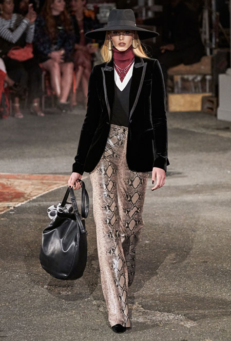 В новом сезоне Томми Хилфигер решил удивлять: спорт-шик, практичность и стиль преппи, которые давно стали главными постулатами коллекций бренда, в новом сезоне были отодвинуты на второй план в пользу ключевых трендов 70-х и 80-х. Поэтому гардероб для наступающего сезона стал настоящей одой классике: бархатные брюки оттенка бордо, платья со змеиным принтом, тяжелый твид, роскошные серебристые костюмы с приталенными жакетами, классические шелковые рубашки и платья с принтом полька-дот. Завершающими акцентами стали шляпы (такие, какие носили в 80-х), классические лодочки и сапоги с присборенными голенищами. Коллекция была разработана совместно с американской актрисой Зендаей и представлена в формате «see now, buy now» – вещи из коллекции уже можно приобрести.