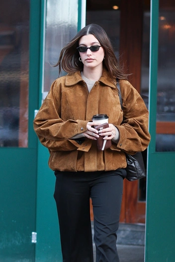 Замша — это тренд 2025 года, который мы заметили еще на показах в прошлом году. А спортивные бомберы — это главная верхняя одежда весны наступившего года, которая будет дополнять образы модных девушек по всему миру. Хейли Бибер подобрала бомбер коричневого оттенка, который сочетала с прямыми брюками и ботильонами с квадратным мысом в ретро-стиле.