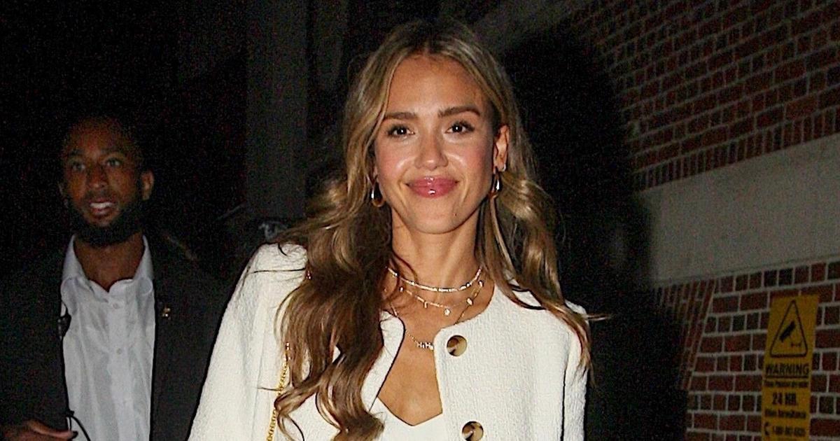 Укороченный пиджак — самая универсальная вещь гардероба на любой сезон, ведь она отлично смотрится с любым низом. Например, с джинсами клеш, как на Джессике Альбе — они делают ноги стройнее. Добавляем к образу туфли на каблуке, которые также вытянут ноги, и безупречную укладку — и получаем классический образ, который всегда работает.