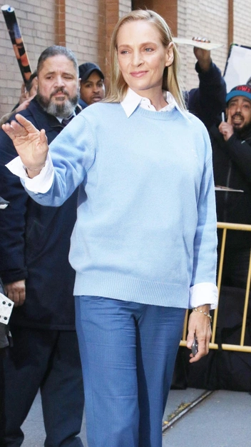 Ума Турман появилась в элегантном образе, который смотрится эффектно за счет подобранных оттенков. В одном выходе она сочетает белую рубашку с голубым джемпером и синими брюками. Стоит отметить, что актриса точно знает, какие цвета ей к лицу: так, трикотаж в небесном цвете визуально придает лицу свежесть и сияние. Если вы желаете добиться такого же эффекта от своих аутфитов, тогда используйте в них светлые тона: это не только голубой, но и пудровый, розовый, зеленый.
