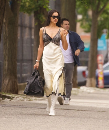 Самая крепкая звездная пара — Ирина Шейк и ее обувь Tabi от Maison Margiela, и на этот раз модель надела новую пару в белом оттенке. Чтобы привлечь еще больше внимания к образу, Ирина сочетала ботфорты с платьем комбинацией с лимонной юбкой с кружевной окантовкой. На Неделе моды в Нью-Йорке модели не было, но, кажется, она ей и не нужна — модель устроила в городе собственное дефиле.