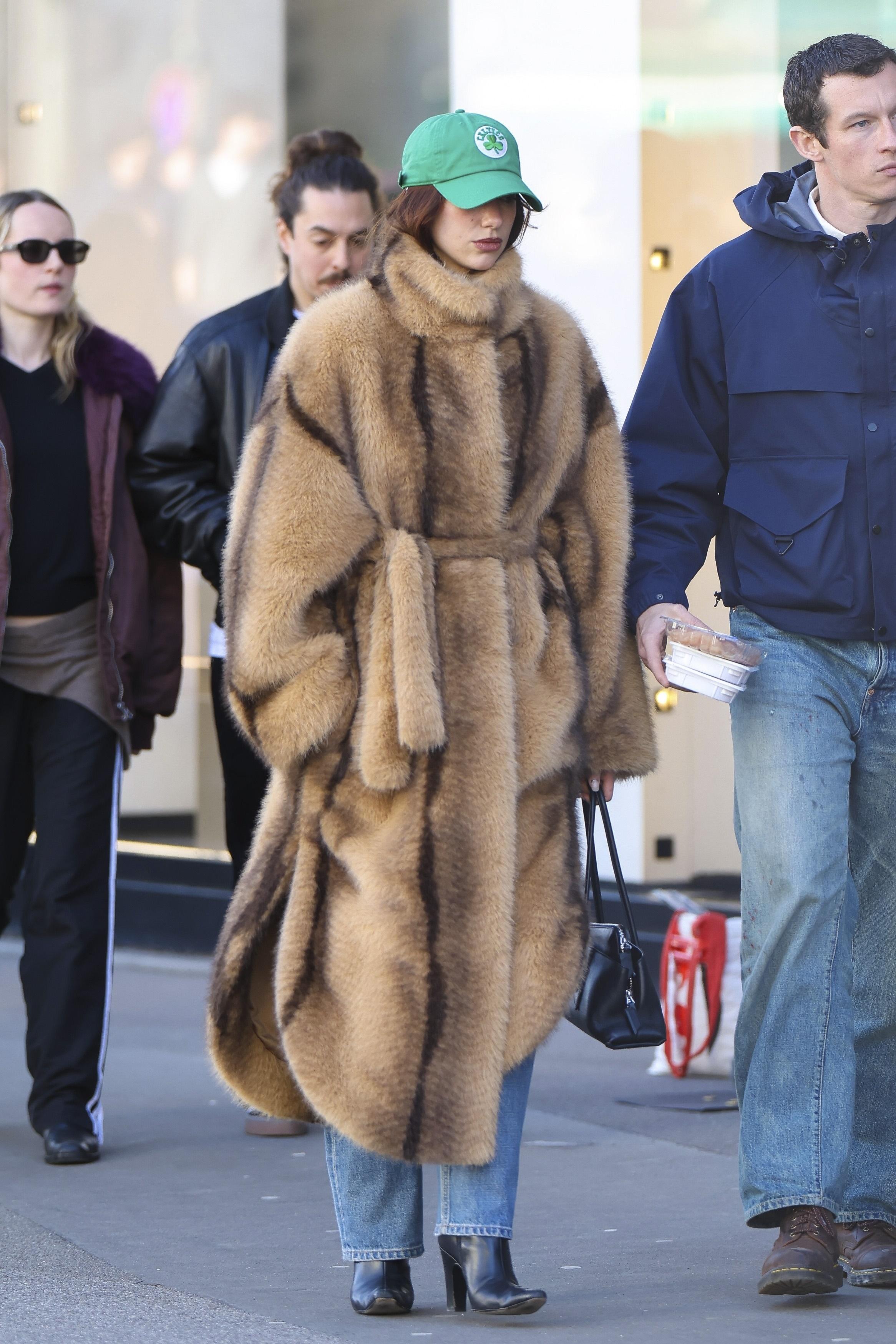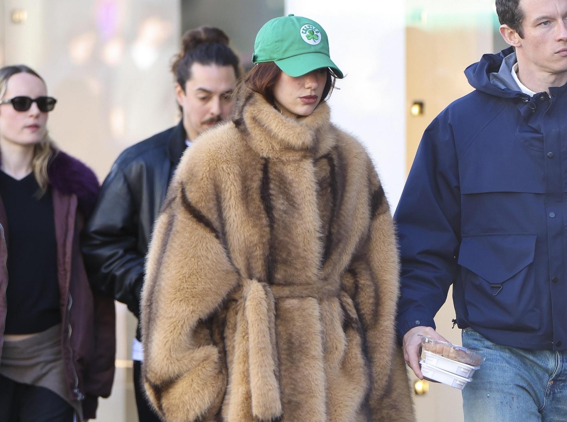 Главный секрет аутфитов Дуа Липы — в той самой «интеллектуальной небрежности», когда кажущаяся случайной роскошь на деле собрана по строгой формуле. Здесь это объемная шуба, под которой скрывается максимально простая база — прямые джинсы, остроносые сапоги, маленькая сумка и спортивная кепка. Дуа как бы прячется в меховом коконе, но при этом мы интуитивно считываем каждую деталь: идеальная длина денима, чтобы ботфорты выглядывали ровно на пару сантиметров, цвет бейсболки, который нарочно «ломает» карамельную гамму.