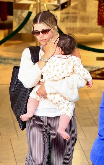 Наример, недавно знаменитость отправилась на прогулку по городу с дочерью, и все время несла ее на руках, скрывая лицо. На Софии был простой, даже пижамный образ с брюками в вертикальную полоску, белым кардиганом из шерсти и топом, а также солнцезащитные очки формы cat eye.