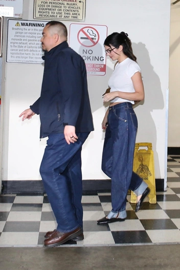 Для расслабленного вечера в центре Нью-Йорка Кендалл предпочла простой, но стильный образ. Он состоял из темно-синих джинсов, футболки белого цвета с укороченными рукавами, а также простых черных балеток. Финишем аутфита стала прическа с крабиком и очки с прозрачной круглой оправой.