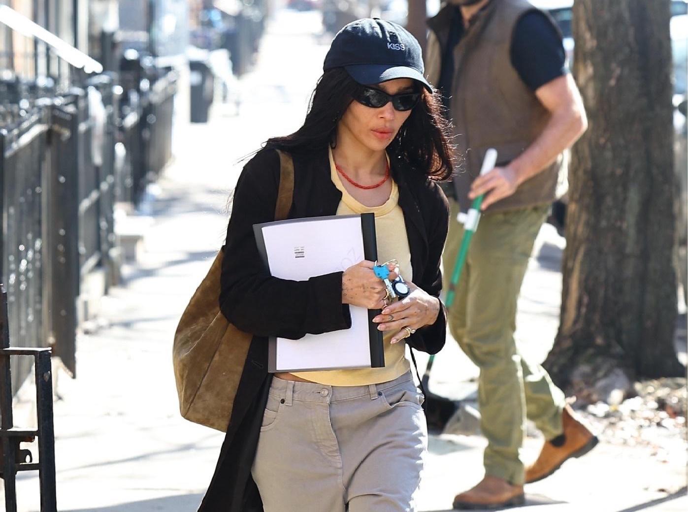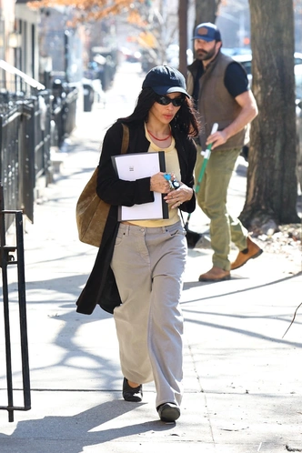 В этом сезоне вам не обойтись без серых джинсов, как у Зои Кравиц: здесь они играют роль той самой «правильной» базы, которая делает образ расслабленным, но крайне притягательным. Широкий, немного мешковатый силуэт, мягкий выцветший серый оттенок и низкая посадка идеально сочетаются с желтым лонгсливом, черным кардиганом, замшевой шопер‑сумкой и кепкой — в итоге обычная прогулка по Бруклину выглядит как тщательно продуманный мудборд для весеннего гардероба 2026 года.
