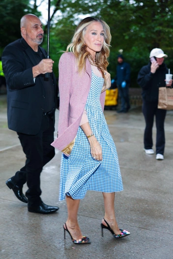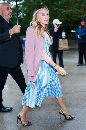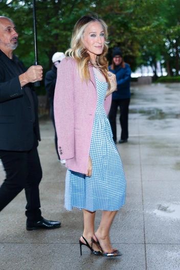 Для выхода Сара выбрала аутфит в своем стиле — трендовый, но оригинальный. Основу составило платье в клетку виши голубого цвета и кашемировый пиджак, а в качестве обуви — лодочки с открытой пяткой от собственного бренда Сары.