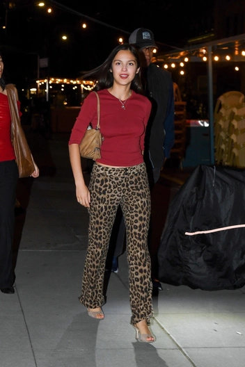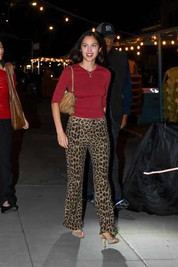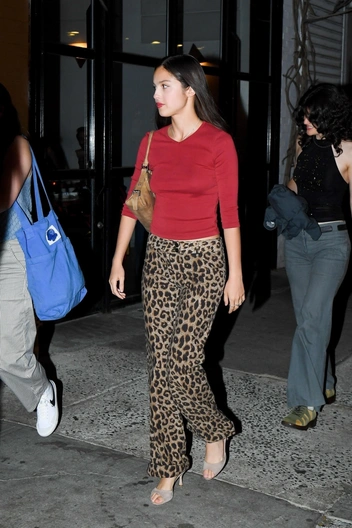 Так поступила Оливия Родриго. Знаменитость поймали в брюках фасона буткат с леопардовым принтом на низкой посадке — такой силуэт будет самым модным в 2025 году. Можно было бы завершить аутфит чем-то спокойным, но Оливия дополнила его алым лонгсливом для акцента. А завершили лук модные в 2025 году мюли — в итоге получился нестандартный, но трендовый образ.