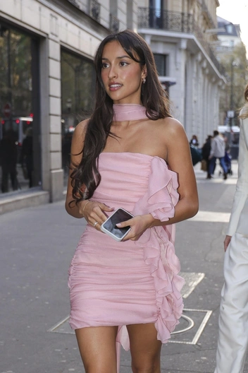 Для одного из последних выходов девушка выбрала платье длины мини из шифона нежного розового оттенка. Повязка на шее и драпировки сделали его более интересным и женственным, а завершили образ лодочки из атласной ткани такого же розового цвета. Бьюти-образ it-girl, как обычно, был натуральным: она завила крупные локоны и сделала макияж с акцентом на румяна.