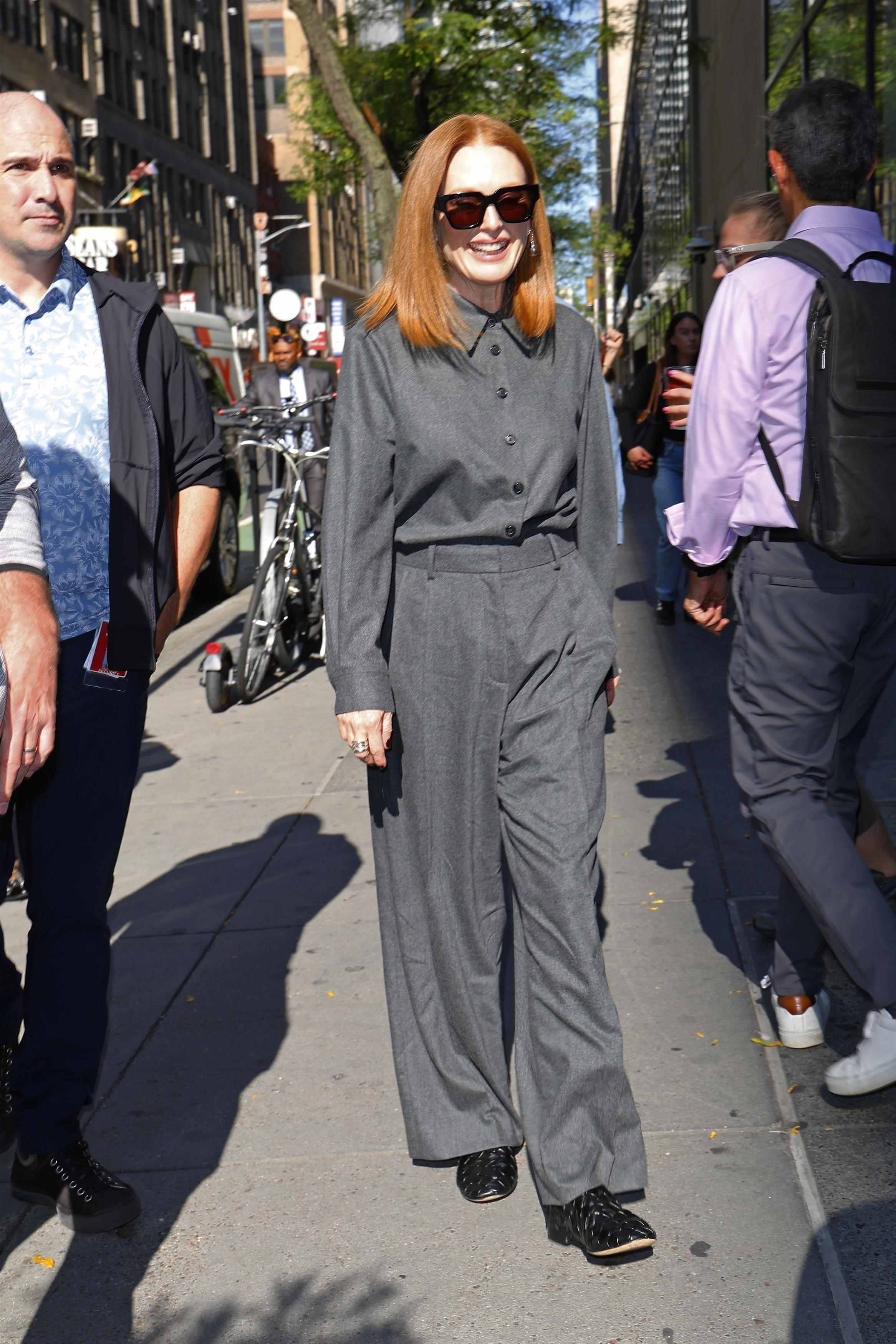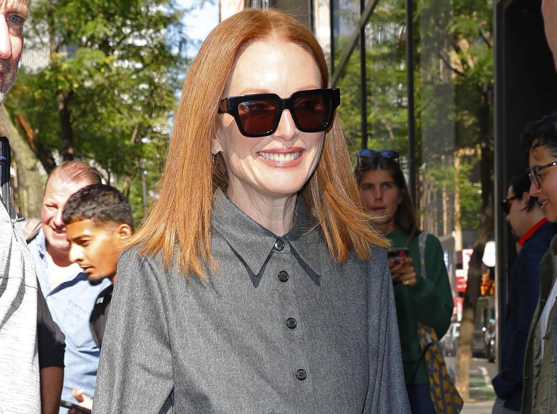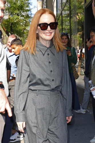 Образы с красных дорожек поражают своей красотой, но повседневые луки знаменитостей интересны не меньше — ведь их легко повторить в обычной жизни. Джулианна Мур, например, советует носить на работу или прогулку комплект из светло-серой рубашки и прямых брюк, совпадающих по цвету. Выход завершаем комфортными мюли на плоской подошве с плетеной кожей — все от Bottega Veneta.
