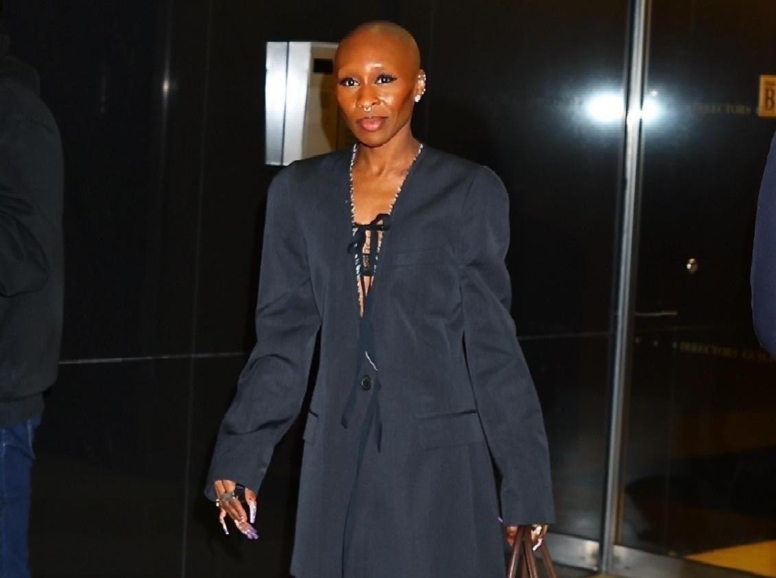 Для выхода на встречу с поклонниками мюзикла «Wicked» Синтия Эриво выбирает смелый и продуманный образ: структурированный удлиненный жакет с открытой линией декольте, под которым — топ с модной шнуровкой. Это добавляет аутфиту нотку гранжа и современности, а черные брюки-клеш только усиливают это настроение. Лакированные туфли на платформе — любимая обувь актрисы — добавляют образу необходимую дозу театральности, без которой невозможно представить любой выход Синтии. Весь лук отлично сочетается с концепцией «business glam» — с намеком на гранж и авангард, который особенно актуален в сезоне.