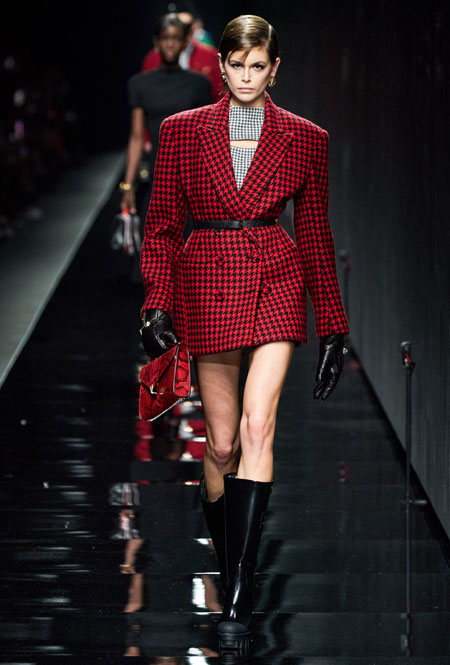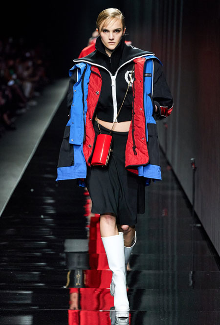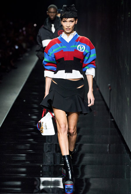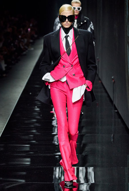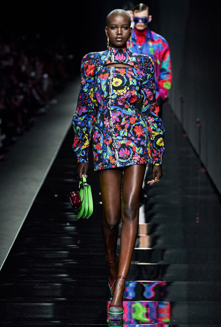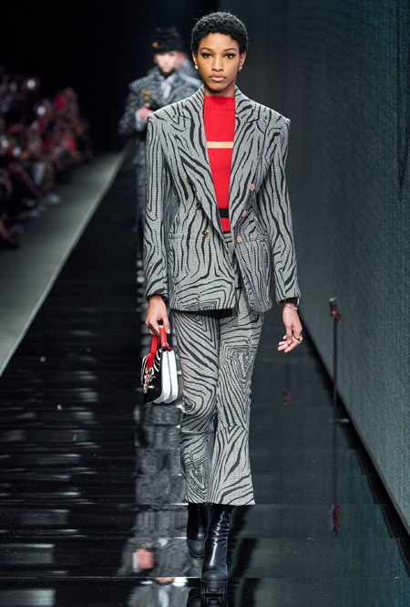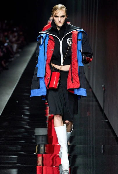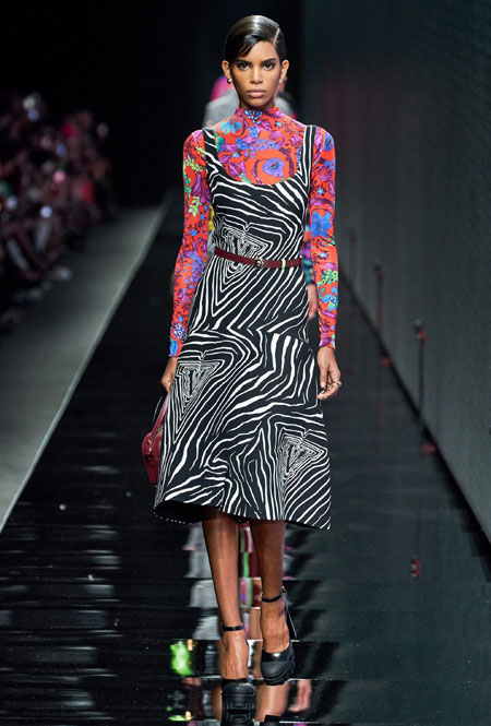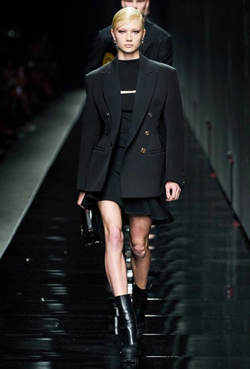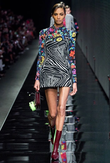 Предыдущий весенне-летний показ Донателлы Версаче запомнился звездным выходом Дженнифер Лопес в финале – без преувеличения она тогда произвела настоящий фурор. В этом сезоне креативный директор Versace решила не привлекать внимание публики неожиданными появлениями селебрити и сконцентрироваться на одежде. Для нового сезона Донателла предложила мини-платья из черного джерси, яркие свитера, спортивные костюмы, оверсайз-жакеты в клетку, платья с анималистичным принтом в паре с красочными водолазками и мягкие шубы.