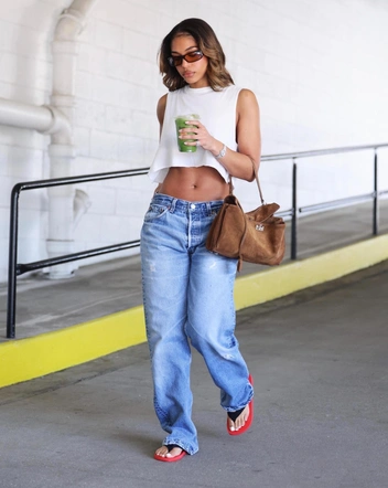 Вьетнамки — это самая модная обувь лета 2025. И особенной популярностью пользуются модели от The Row с красной подошвой и черной перемычкой, которые уже появились в гардеробах многих звезд. Не исключением стала и модель Лори Харви — девушка сочетала вьетнамки с расслабленными джинсами и топом с асимметричным вырезом. Выход завершила сумка Rodeo от Balenciaga в редком замшевом исполнении.