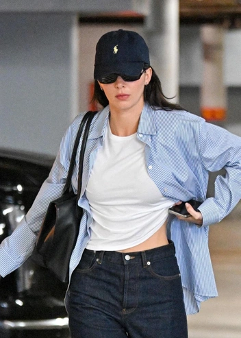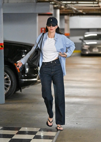 Кендалл сочетает открытые шлепки с классическими джинсами и голубой рубашкой. Это базовый набор одежды, который есть в гардеробе у каждой. Дополняем его чем-то трендовым, как Дженнер, и образ уже выглядит свежее.