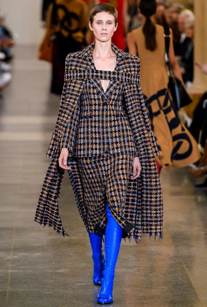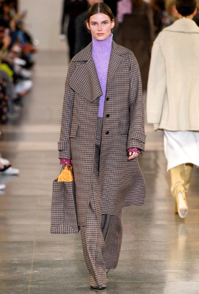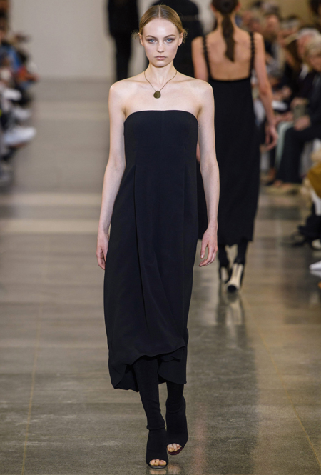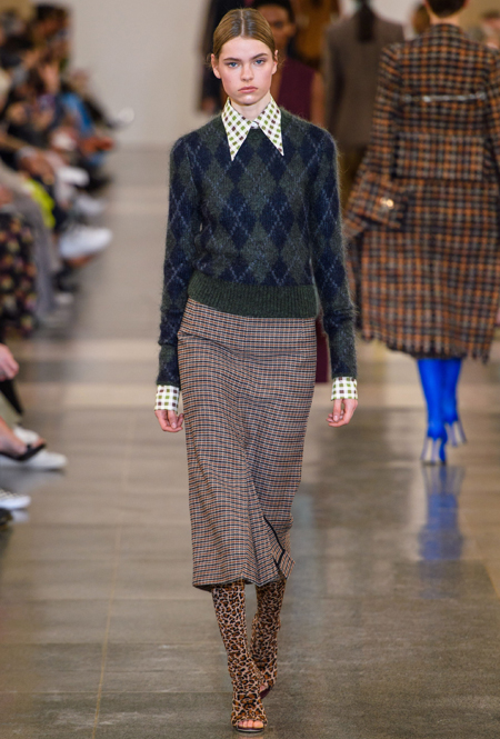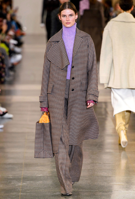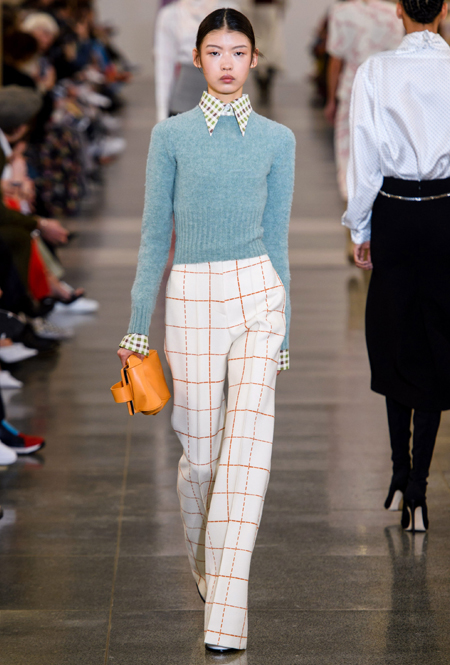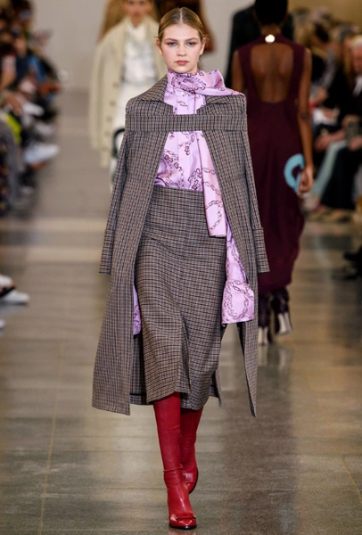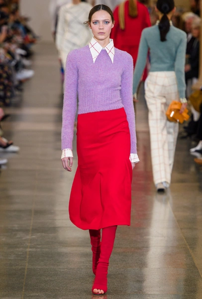 В будущем сезоне дизайнер вновь обращается к своему излюбленному свободному крою и минимализму, одевая современную леди с претензией: поэтому к приглушенной палитре добавляются броские акценты в виде алого, который всецело проявился и в весенне-летней коллекции, а также яркие детали цвета индиго. В основе коллекции – классические пальто, джемперы с орнаментом аргайл, юбки-карандаши в клетку и расклешенные брюки из 70-х, а в обувной линейке дизайнер представила облегающие ботфорты с вырезанным носом, которые уже давно активно выгуливает и сама.