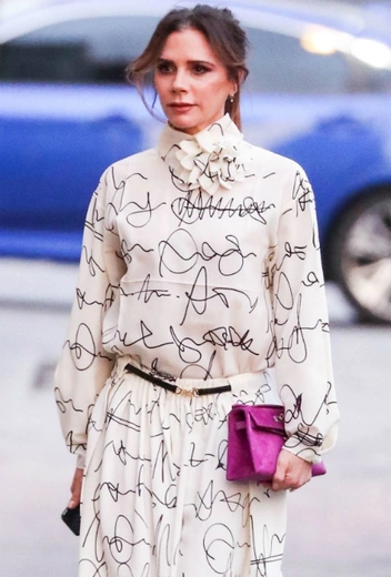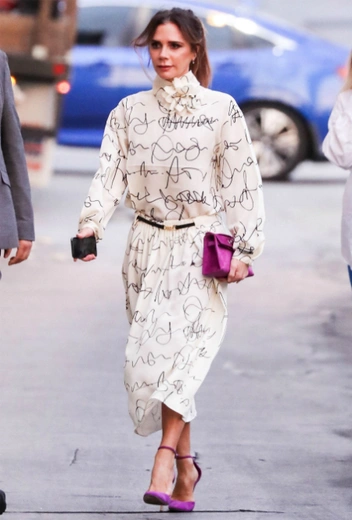 Всегда лаконичная Вики решила в этот раз выйти за рамки минимализма и дать волю креативу: на шоу Jimmy Kimmel Live супруга Дэвида Бекхэма выгуливала подпоясанное кремовое платье с графикой, дополненное малиновым мини-клатчем и туфлями в тон аксессуару. Несмотря на любовь Бекхэм к выдержанности и деловому стилю, в этом выходе нотка непринужденности и непосредственности все-таки взяла свое.