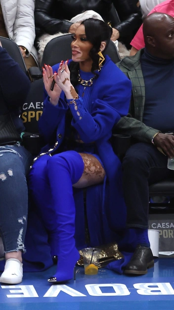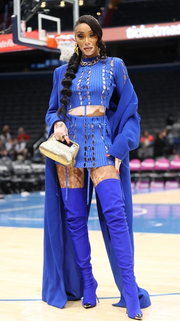 Винни Харлоу отправилась смотреть баскетбольный матч не в джинсах и худи, как это делают многие, а в синем тотал-луке, за основу которого она взяла полупрозрачный костюм из вязаного топа и мини-юбки. К нему звезда подобрала ботфорты на высокой шпильке и длинное оверсайз пальто. В качестве украшений она выбрала золотые массивные серьги и цепь и дополнила их блестящим клатчем.