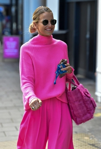 Несмотря на то, что ярко-розовые оттенки стилисты советуют оставлять для летних выходов, многие звезды намеренно нарушают это «предписание» и пробуют активно включать розовый в свой повседневный casual. Британская телеведущая Вог Уильямс предлагает пойти дальше и попробовать украсить осенний стритстайл тотал-луком в самых ярких оттенках розового. Знаменитость сочетает свитер, укороченные широкие брюки и кроссовки для стильного образа в total-pink. Звезда дополняет аутфит черными солнцезащитными очками и вместительной сумкой в тон лука.
