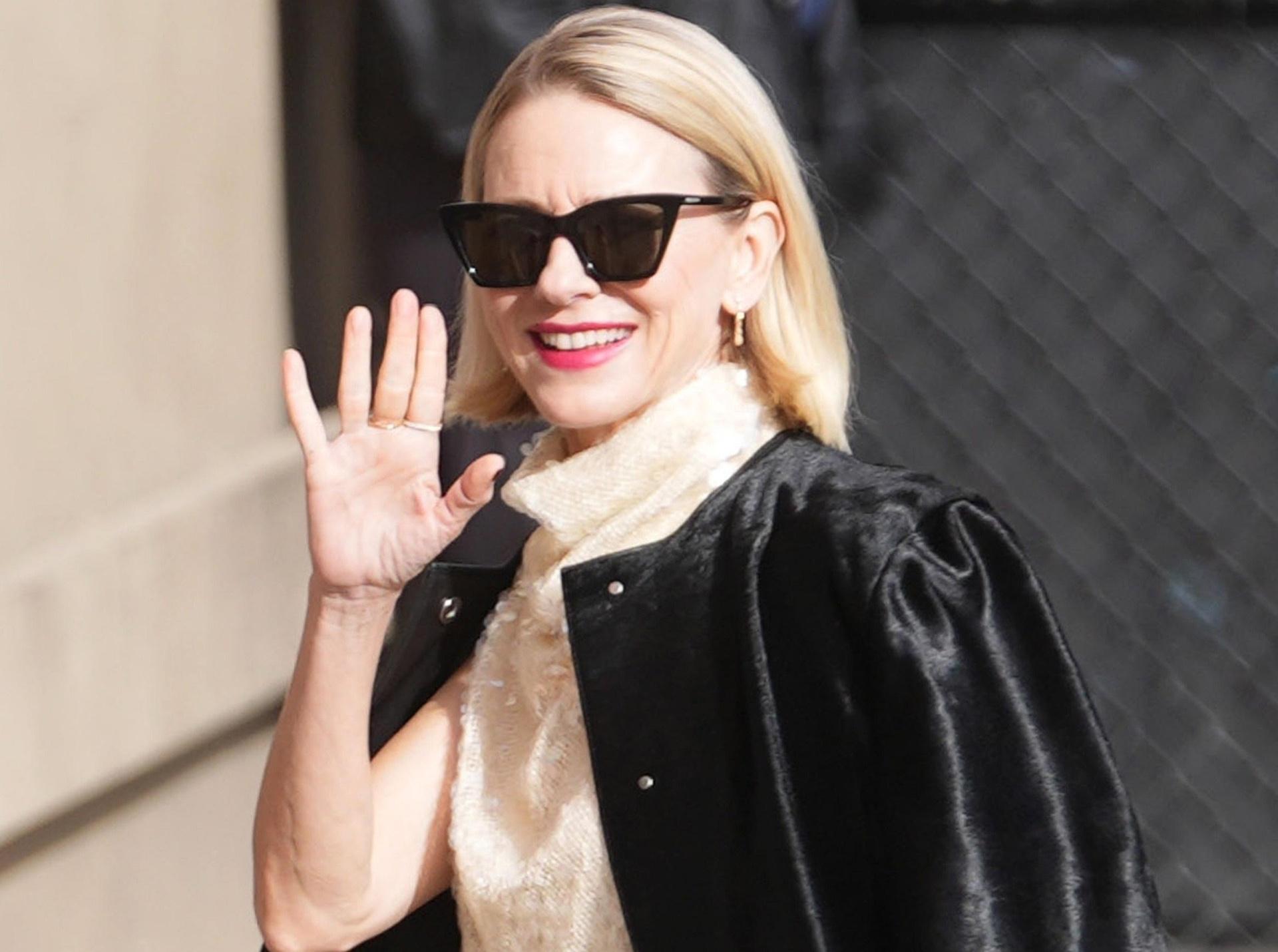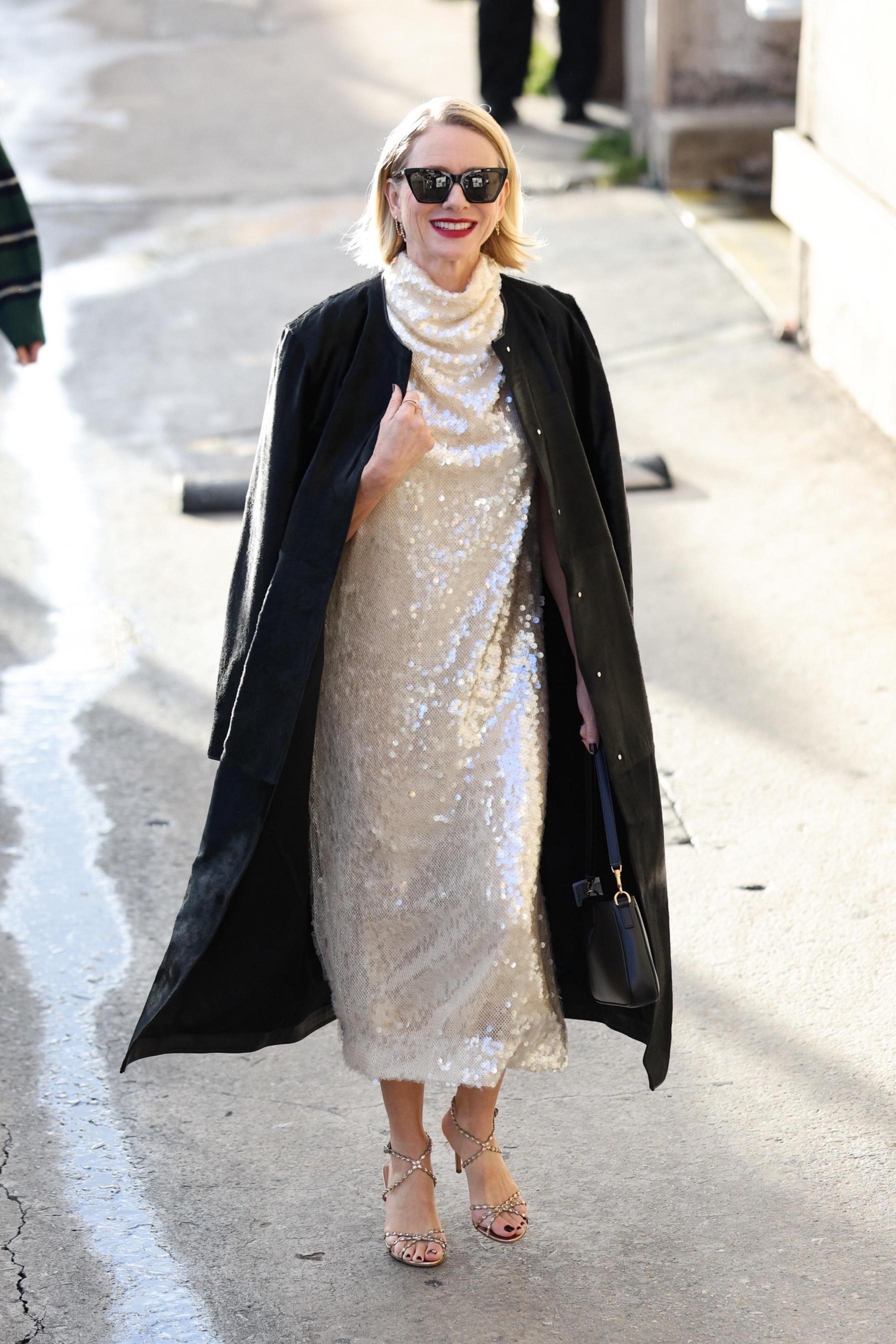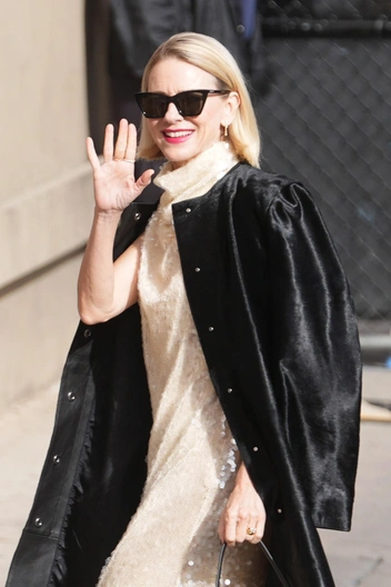 Британская актриса посетила ток-шоу Джимми Киммела. На фотографиях Наоми действительно сияет — и дело не в ее широкой улыбке. Платье-миди с массивным воротом расшито глиттерами благородного кремового оттенка: при свете дня оттенок кажется жемчужным. Еще больше удивляет выбор верхней одежды — черное удлиненное пальто Уоттс выполнено из натурального шелка. Видимо, актриса умышленно проигнорировала наставление стилистов делать всего один яркий акцент. Боссоножки на шпильке, расшитые кристаллами, очень напоминают знаменитый айтем Valentino.