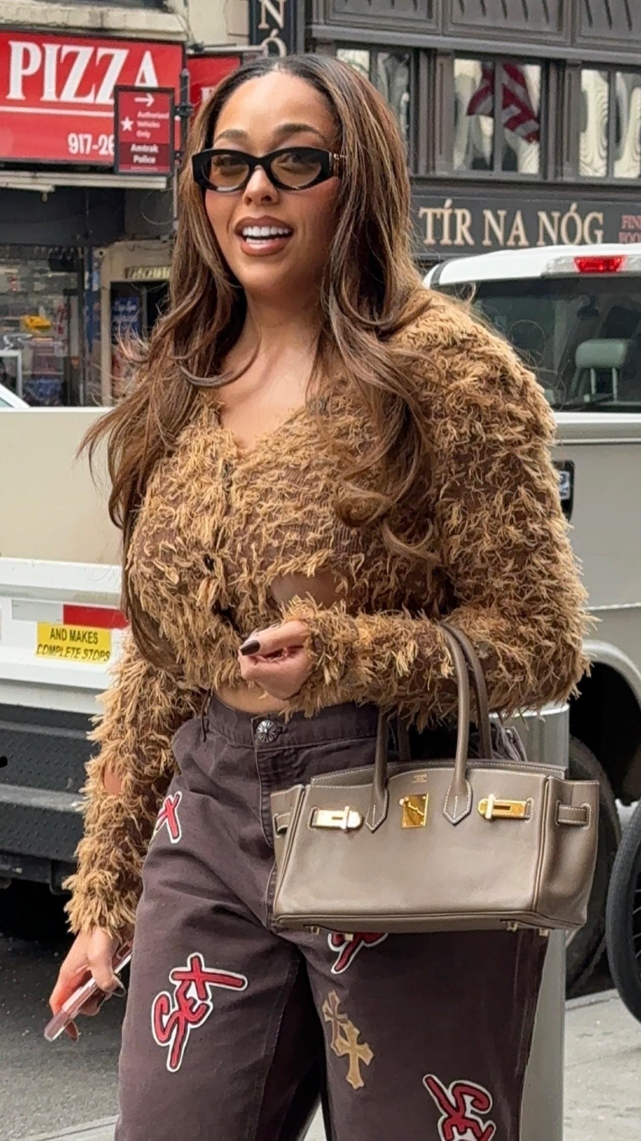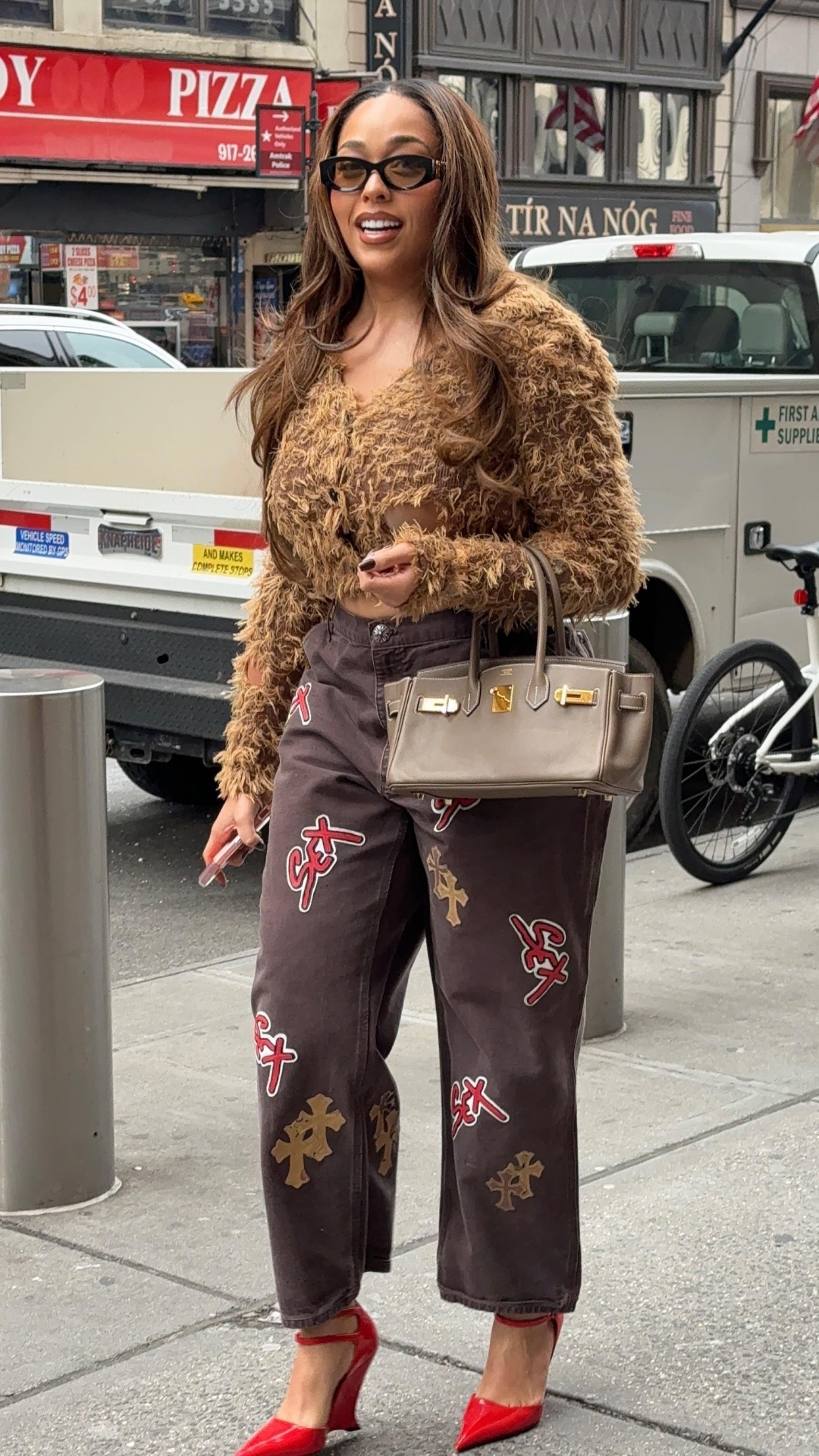 Джордин Вудс — богиня максимализма, которая умеет грамотно сочетать в одном образе несколько акцентных вещей. Для своего последнего выхода она выбрала красные туфли со структурным каблуком, джинсы с яркими нашивками и кардиган необычной фактуры, напоминающей то ли шерсть, то ли перья экзотической птицы, а «уравновешивает» образ маленькая бежевая Birkin. Но самое главное — заметно невооруженным взглядом, что Джордин чувствует себя в таком аутфите крайне уверенно, от чего весь лук выглядит органично и притягательно.