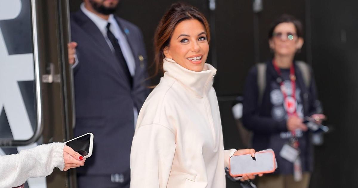 Главный тренд Недель моды FW/2025-26 — это удлиненный ворот, полностью покрывающий шею. Бренды показали как тренчи, так и элегантные жакеты такого силуэта — но эту тенденцию в спортивном исполнении мы еще не видели. До недавнего выхода Евы Лонгории — девушка вышла в костюме одного из своих любимых оттенков, бежевого, который идеально сочетается с ее тоном кожи.