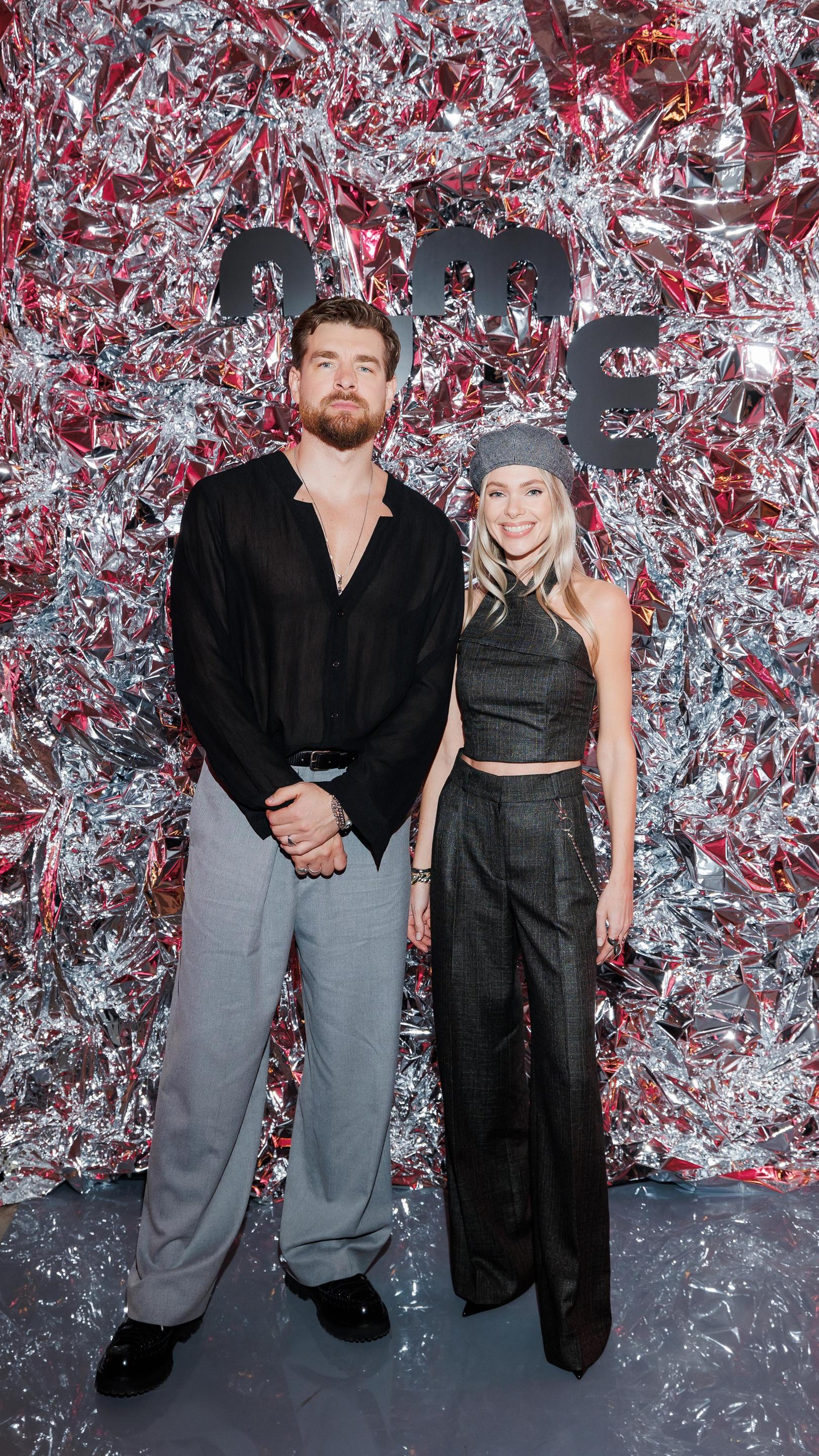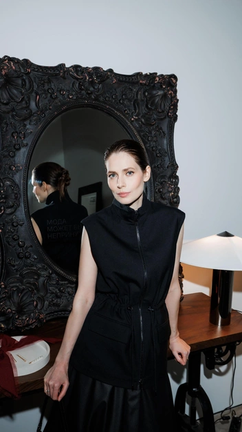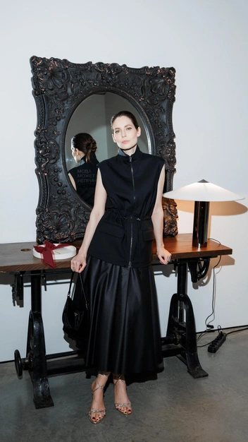 Гости мероприятия отразили эстетику Nume в своих нарядах. Так, Юлия Снигирь выбрала для вечера безупречный черный тотал-лук: она надела удлиненный жилет, эффектную юбку миди и дополнила их кожаной сумкой и акцентными серебристыми босоножками.