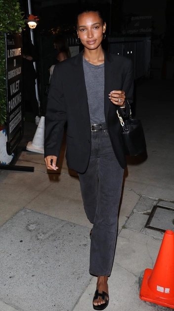 По мнению американской модели, нет ничего более эффектного и стильного, чем сочетание базовой графитовой футболки, серого денима и черного жакета в мужском стиле. В таком аутфите Жасмин Тукс отправилась на ужин с друзьями в Сата-Монике. Стильный образ дополнили кожаные слайды и небольшая сумка.