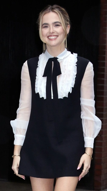 Зои Дойч прибыла на ток-шоу Дрю Бэрримор в образе школьницы. Американская актриса надела мини-сарафан и прозрачную блузу с нежным воротом и акцентным бантом. К этому аутфиту безупречно подошли лаконичные кожаные сапоги и модные браслеты-кольца, которые и украсили минималистичный выход Зои.