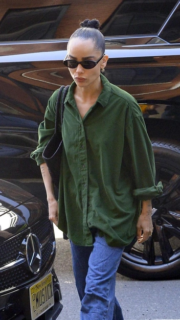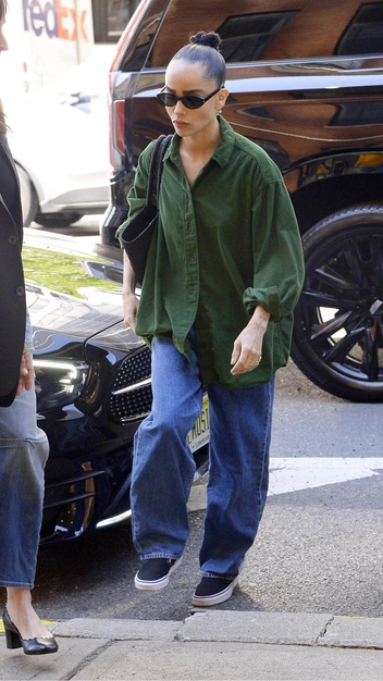 Папарацци поймали Зои Кравиц на улицах Нью-Йорка в расслабленном образе — в них она всегда привносит нотку элегантности. Актриса примерла оверсайз рубашку, широкие синие джинсы и дополнила их слипонами на акцентной белой подошве. Женственность аутфиту придали минималистичные украшения, кожаная сумка-тоут и очки узкой формы. За шик отвечала прическа — безупречный гладкий пучок.
