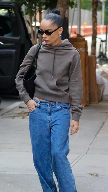 Знаменитость отправилась на шопинг вместе со своим отцом Ленни Кравицем и выбрала для прогулки расслабленный образ. Она надела укороченное худи в коричневом оттенке и подобрала к нему джинсы актуального дизайна. У них классический синий цвет, низкая посадка, прямой удлиненный крой — брючины можно подвернуть или завернуть их в кроссовок, как это сделала Зои. Завершили лук базовые кеды, очки и сумка-тоут.