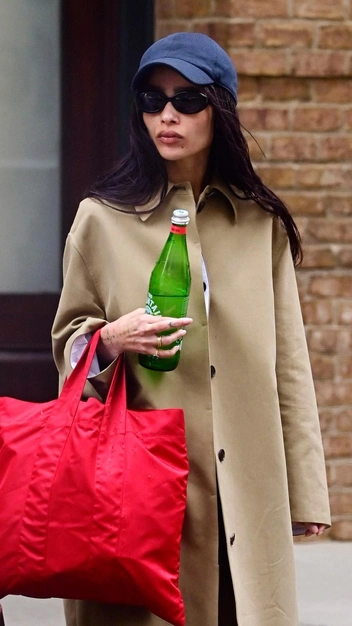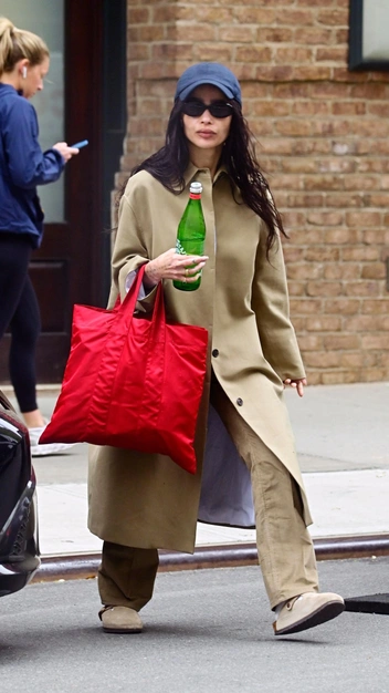 Зои Кравиц для аутфита выбрала тотал-беж и не прогадала: этот оттенок пользуется спросом среди звезд, ведь он всегда смотрится дорого и статно. Актриса примерила брюки в мужском стиле и накинула поверх строгий плащ с воротом, как у рубашки, и акцентными пуговицами. Дополнила она выход бежевой обувью, напоминающей нам уютные домашние тапочки, и синей бейсболкой с красным шоппером.