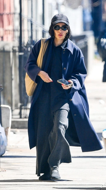 Зои Кравиц отправилась на прогулку в модном аутфите, который мы предлагаем вам повторить этой весной. Актриса надела теплый костюм из трикотажной рубашки и широких штанов и дополнила его эффектным синим тренчем, без которого этот сезон нам трудно представить. Завершила она выход стильными тапочками, классической кепкой, акцентным шоппером и солнцезащитными очками.