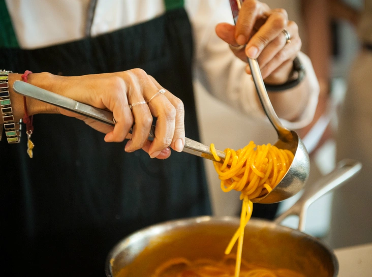 После состоялся мастер-класс, на котором шефы поделились секретами итальянской кухни в современном прочтении. «Мой девиз – challenge yourself – брось себе вызов. Я люблю пробовать новое, будь то техника или ингредиенты, а еще я за здоровый образ жизни. Сегодня, например, мы готовили пасту с томатным соусом. Очень простое блюдо, но мы, во-первых, интересно его обыграли – коптили томаты, а во-вторых, использовали лишь две ложки оливкового масла и все, больше никаких жиров. Я не понаслышке знаю, что питаться вкусно и при этом здорово не так уж сложно. Даже если вы рьяный поклонник итальянской кухни».