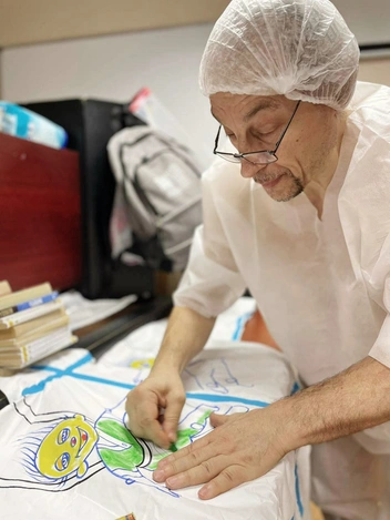 Я объясняю, что прихожу для положительных эмоций, поддерживать иммунную систему. Знаете, я даже костюм-тайвек расписал картинками. К кому стою спиной, все равно видят веселые рисунки.