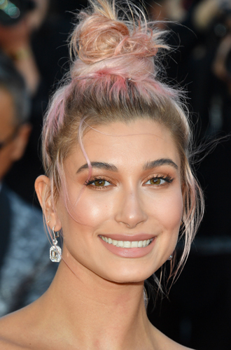 Тональность нежному макияжу модели задал ее стилист ─ звездная девушка Джен Эткинс (@jenatkinhair ─ кстати, она же в Каннах-2018 причесывала Беллу Хадид и Кендалл Дженнер). В мейк-апе Хейли прекрасна перекличка тонированных волос с легкими розово-персиковыми оттенками. Обратите внимание, что тени и помада в макияже не розовые, а нюдовые. Плотной подводки по верхнему (а тем более, по нижнему) веку также не требуется.